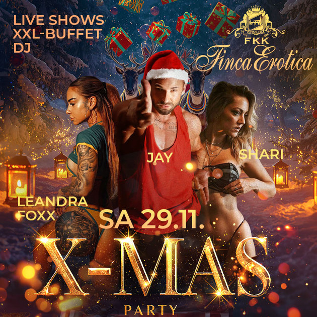 Die Zutaten sind simpel, der Geschmack grandios: Angeführt wird das bunte Partyprogramm von den Headlinern Leandra Foxx und Shari - zwei begnadeten Erotikstars, die in ihren Shows ganz viel Haut und geile Erotik zeigen. Dazu gesellt sich als männliches Pendant noch Potenzprotz Jay, der seine(n) Muskel(n) spielen lässt! Gut im Geschmack liegt selbstredend auch die Bewirtung, die mit einem reichhaltigen XXL Christmas Buffet gewohnt leckere und reichhaltige Kost serviert, um als Gast gestärkt zu sein für das, was diese Party mit sich bringt. In erster Linie ist das natürlich der Spaß, den man hier aus Wellness, Erotik, Musik (DJ), Shows und Partystimmung generiert, in zweiter Linie ist es der Mehrwert einer schönen Erinnerung, den man mitnimmt und der einen immer wieder in die Finca treibt. Zu Recht, wie man hier lesen und am Samstag, den 29.11.2025 in der Finca erleben kann - die Weihnachtszeit ist dort nämlich immer etwas ganz Besonderes, und wenn es um die Xmas Party geht, dann gilt das um so mehr! |