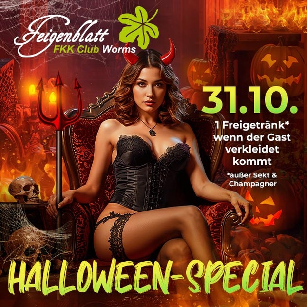 Und so funktionierts: Wer als Gast zum Beispiel als Vampir oder Werwolf oder auch gerne ganz anders verkleidet in einem Kostüm seiner Wahl am 31.10. den FKK Club Feigenblatt in Worms besucht, bekommt dafür ein leckeres Freigetränk spendiert*. Einfacher kommt man da wirklich nicht ran! Dann wirs es spannend, denn mit dem Drink in der Hand ist man bestens ausgestattet, um den Kampf aufzunehmen gegen wen auch immer, nur um direkt festzustellen, dass hier viel lieber gemocht wird als gemordet. Und dann macht man natürlich auch dabei gerne mit, denn das wird garantiert ein unheimlich geiles Erlebnis! *außer Sekt und Champagner |
