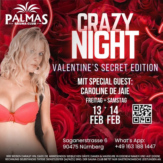 Es wird darauf hingewiesen, dass die anwesenden weiblichen Gäste (Damen & Masseure) in eigenem Namen und auf eigene Rechnung selbständig tätige Dienstleister (m/w/d) sind. Sie sind nicht Subunternehmer oder Angestellte des Sauna Clubs Palmas. Sämtliche angebotenen und kostenpflichtigen Dienstleistungen werden als Geschäftsbeziehung ausschließlich zwischen diesen Unternehmerinnen und den männlichen Gästen eingegangen. Der Sauna Club Palmas hat keinen Einfluss auf die Ausgestaltung und die Abwicklung. |